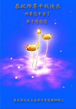 師尊您好,師尊辛苦了。我們重慶合川大法弟子一家恭祝師尊中秋節快樂。我們一定做好三件事,學好法修好自己,講真相,多救眾生, 兌現大法弟子的誓言,圓滿隨師還。