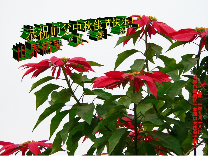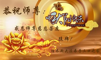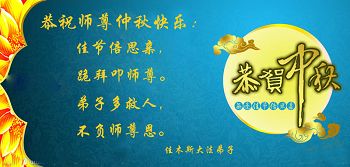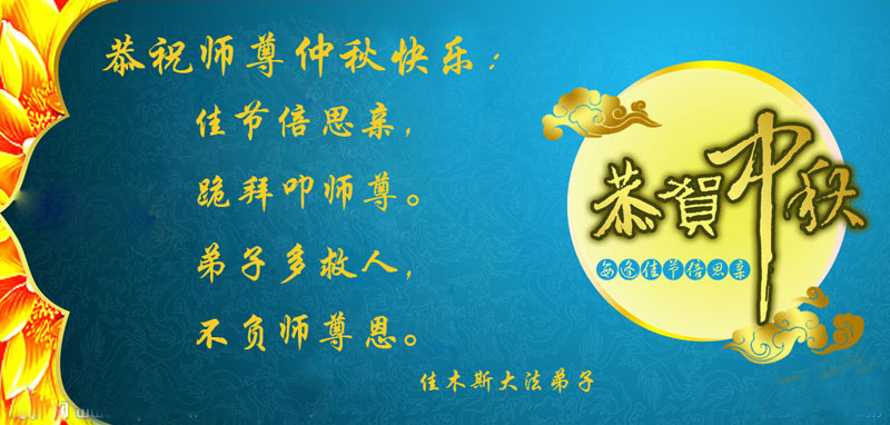 師父您好,師父您辛苦了!十幾年的修煉中,弟子深切的感到師父時刻看護著弟子,像慈父一樣呵護引領著弟子,從無怨言、從無責備。師父為弟子付出的心血太多太多,師父的恩德重如泰山,弟子無法報答。在這中秋佳節,弟子思念師父,請師父收下弟子誠摯的問候與祝福,祝師父中秋快樂!
