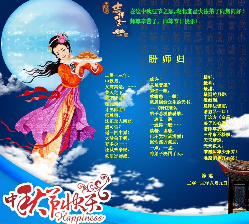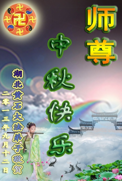 在二零一三年中秋佳節即將到來之際,湖北省孝感市安陸市一大法弟子及全家在此感謝師尊一年以來對弟子及全家的慈悲呵護,並預祝師尊節日快樂。