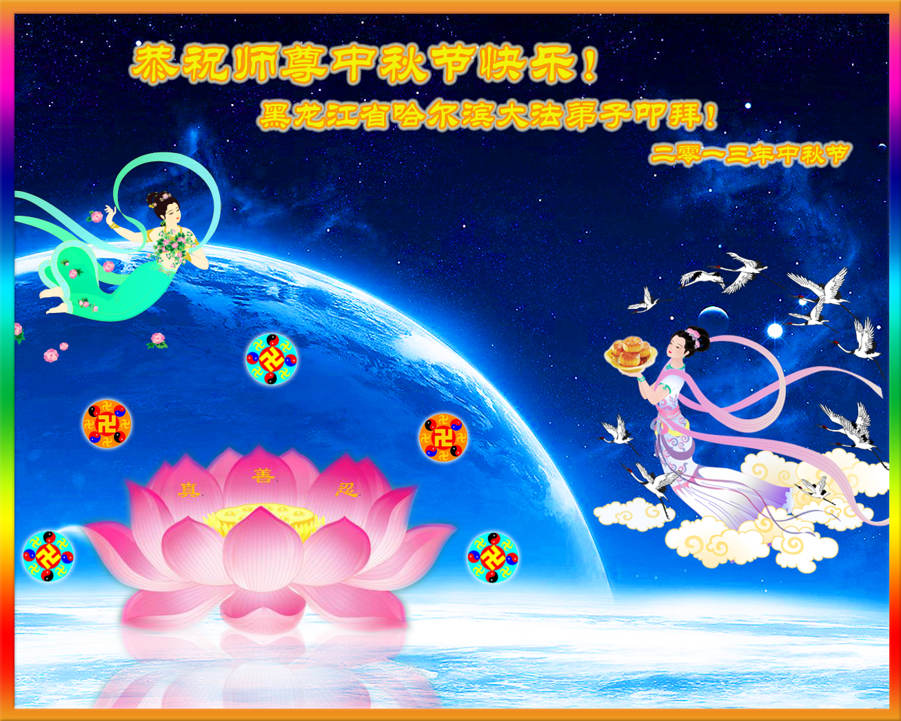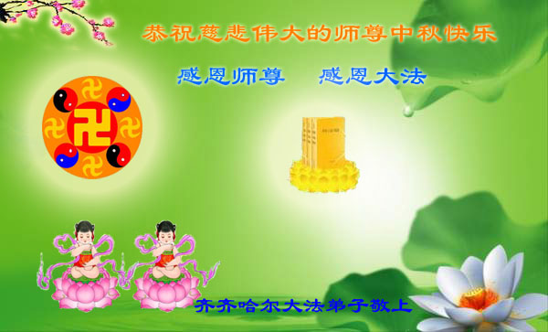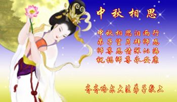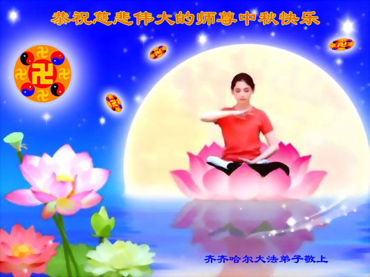 又一個中秋來臨,想念師父!感恩師父的慈悲和救度!師父為眾生承受一再延續著時間,弟子們更要精進,不斷的去掉後天的執著和觀念,信師信法、正念正行,在修煉中不斷地提高心性,學會真正的向內找,按法的要求修正自己,做好三件事,讓更多的人明白真相,圓滿隨師還。