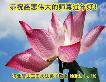在2014來臨的時候,我們唐山市豐潤區講真相小組的大法弟子懷著崇敬的心情叩拜師尊,遙拜師尊過年好!師尊您辛苦了!為了我們,為了眾生,您操盡了心血,弟子們感恩師尊的慈悲苦度,不忘師尊的叮囑,多救人,做好三件事,盼師尊早日回到中國,回到我們身邊,我們能夠與師尊一起同度佳節。普天同慶大法洪傳!