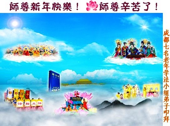 我們學法小組七名老年大法弟子向師尊叩拜:慈悲偉大的師尊新年好!師尊您辛苦了!