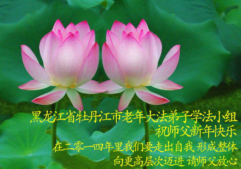 黑龍江省牡丹江一老年大法弟子學法小組祝師父新年快樂!