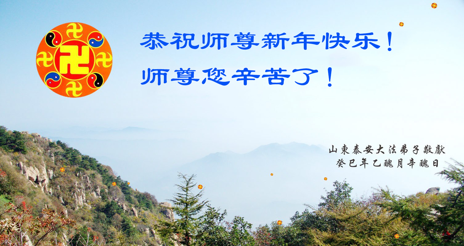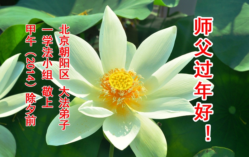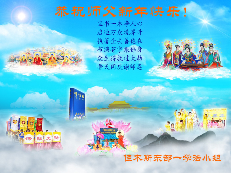 慈悲偉大的師尊:甲午年之際,我們給您叩首拜年!您將我們從地獄裏撈起,用清水給我們洗淨,用大法把我們度化,又一次次的把我們從摔摔打打中扶起、走正──千感慨,萬謝恩,唯有真願化決心:無論時間再長短,緊緊抓住師尊的手,三件事中修好自己,救度眾生,精進不停,圓容師父所要,就要師父所要,其它誰的都不承認!