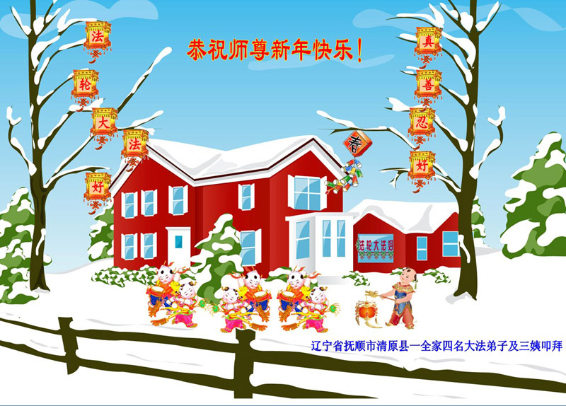 遼寧省撫順市清原縣一全家四名大法弟子及三姨恭祝師尊新年快樂!