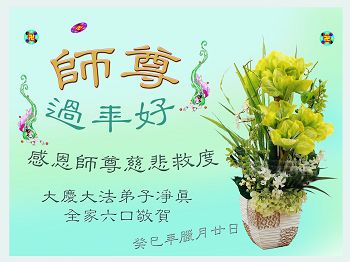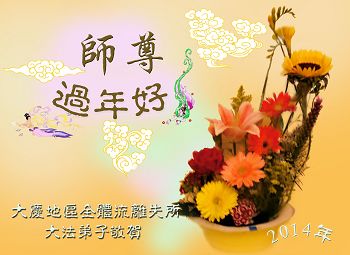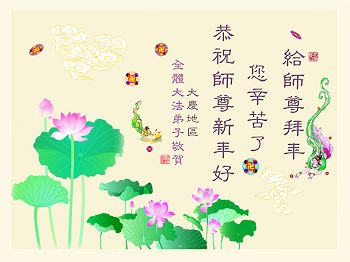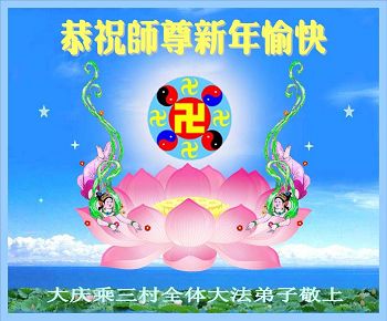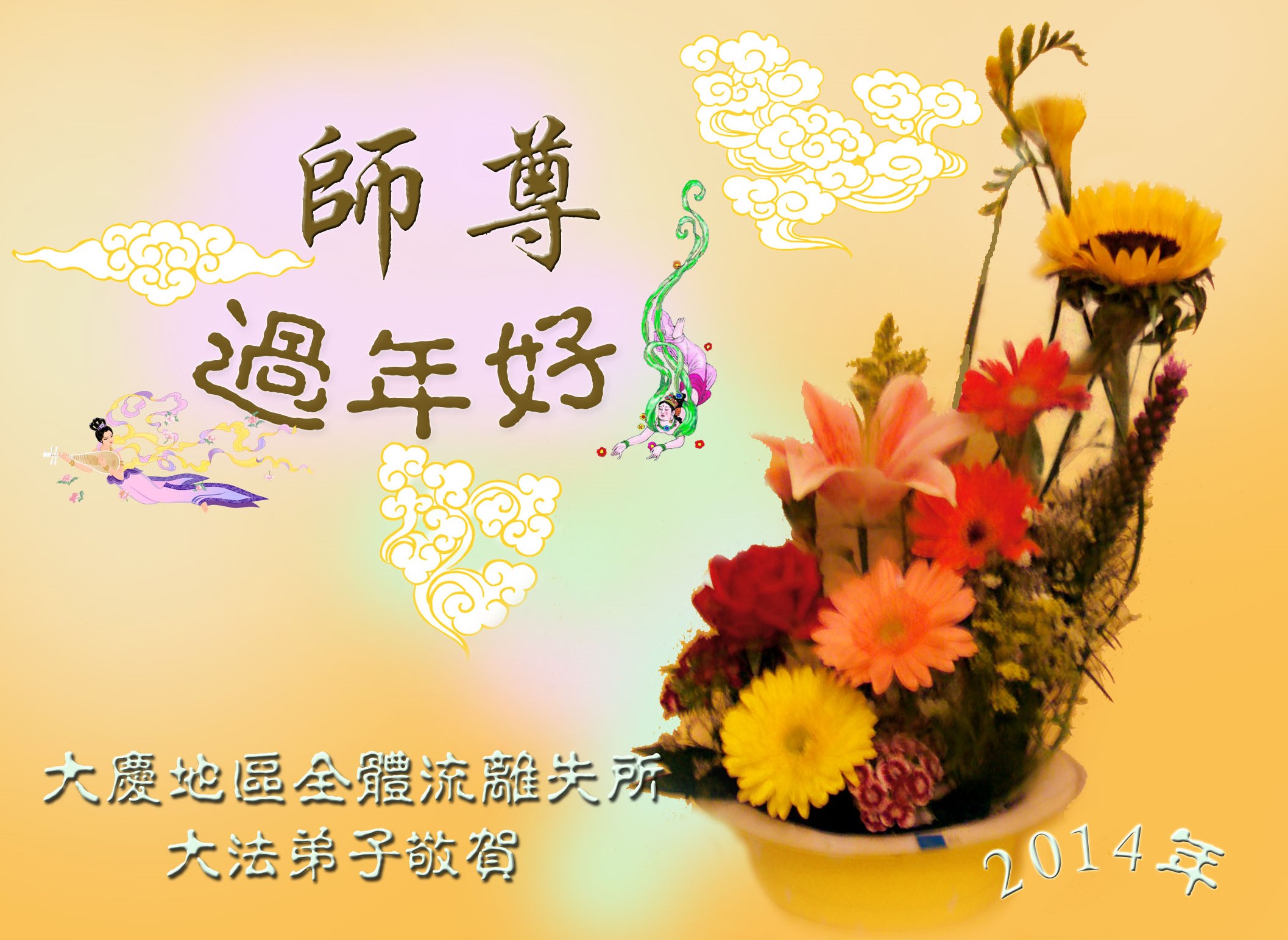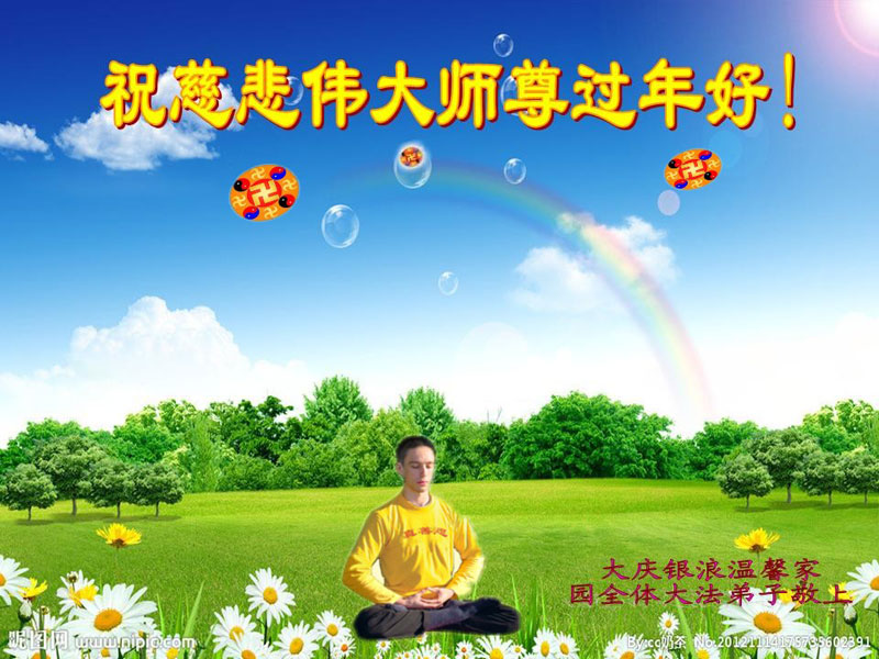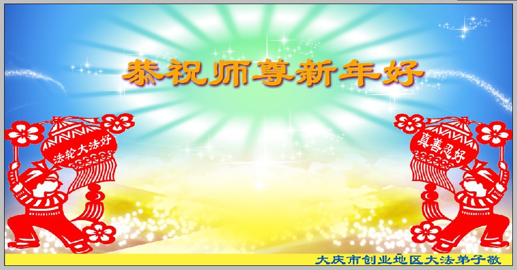 師父,我想對您說:我們不再是迷癡的生命。是您,打開我們塵封的記憶,讓我們紅塵夢醒。為我們剝去那層重重的人的殼兒,又把我們從地獄裏撈起、洗淨。您給我們淨化身體、淨化心靈,教我們遇事無條件向內找,先他後我,無私無我,帶我們走在神的路上,擁有大法弟子的榮耀,擁有神的榮耀。您,慈悲眾生,不放棄每一個有緣的生命。為弟子承受,為眾生承受,嘗盡了千般苦、萬種痛。您,呵護著每一個弟子,不讓一個落下。我們也一定要爭氣啊,讓師父少操一份心,做好三件事,早日跟師父回家!在甲午年來臨之際,大慶大法弟子給您拜年:感謝師恩浩蕩,遙祝您偉大的師尊新年快樂!我們一定會勇猛精進,助師正法,完成大法弟子的史前大願,不辜負師尊厚望。