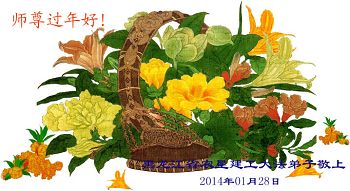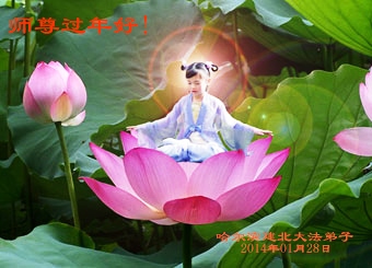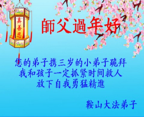 師父您辛苦了。弟子在新的一年裏要勇猛精進。助師正法、聽師父話,做好三件事。多救度眾生,弟子代表全家給師父拜年。