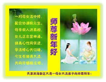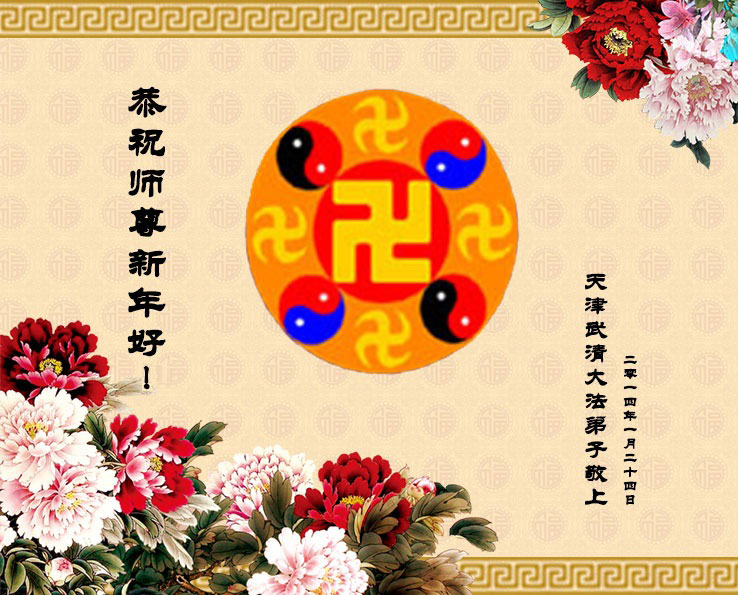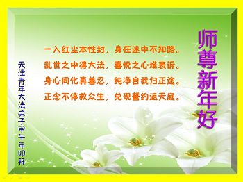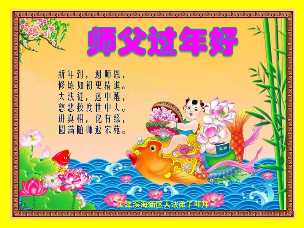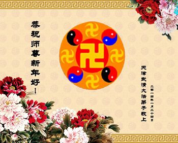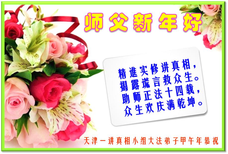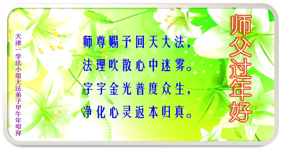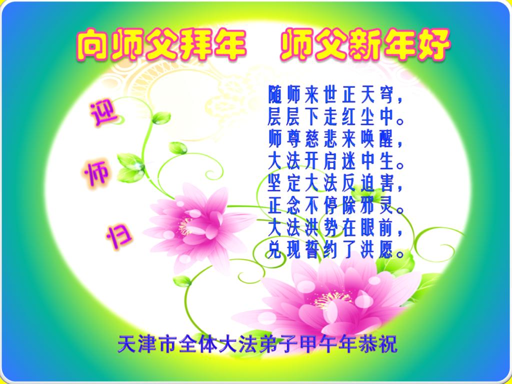 天津市全體大法弟子在新年到來之際,向偉大的師父問好,師父您辛苦了,弟子們會牢記師尊教導,精進實修,在新的一年中更好的講清真相,救度更多有緣人,不辱使命!!