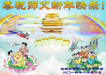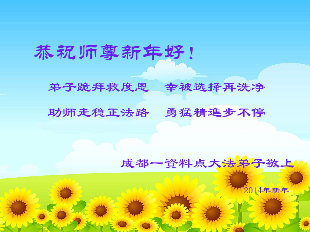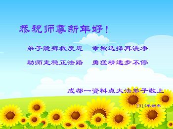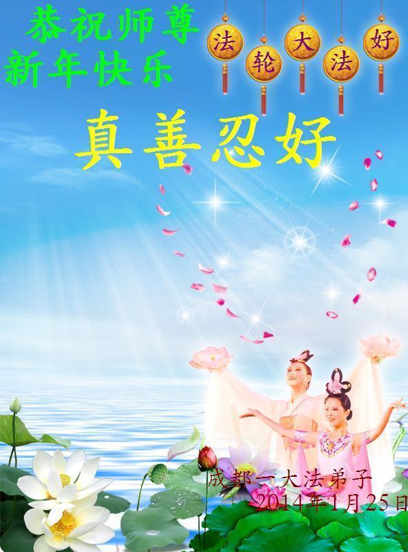 在甲午年即將到來之際,在正法進程將近尾聲的今天,在世人越來越多的明白真相,認同大法並謝謝大法救度之恩的可喜形勢下,四川成都及周邊區縣大法弟子衷心恭祝慈悲偉大的師父新年快樂!弟子們將精進實修,再接再厲,做好師父要求做好的三件事,救度更多眾生,讓師父在新的一年更少幾分操勞,多幾分欣慰。