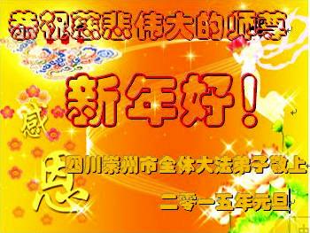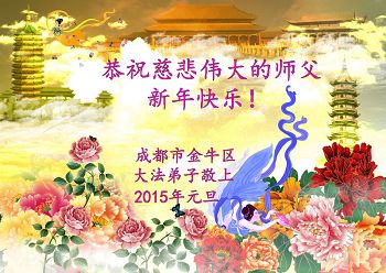 慈悲偉大的師尊:在歷史最關鍵的時刻,即將迎來2015年元旦,此時此刻我們四川成都崇州全體大法弟子懷著無比崇敬的心情祝師尊元旦快樂!不久歷史就將翻過這一頁,我們深深的知道,今天我們與師尊同在,與法同在,我們是宇宙中最幸運的生命,我們決不辜負師尊給予我們的一切,不畏艱險地繼續救度迷中的世人,兌現我們遠古的承諾。