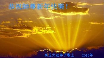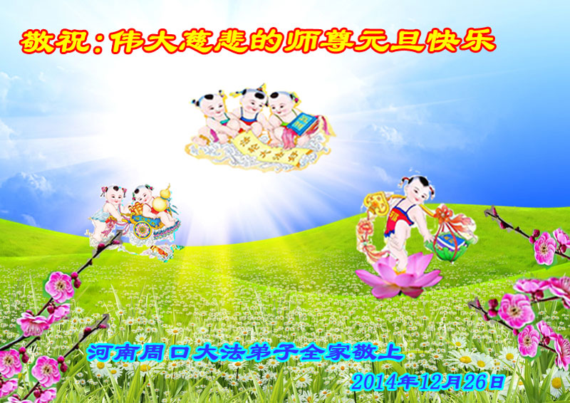 2015年即將到來,河南洛陽大法弟子家庭三人向慈悲偉大的師父致以節日的問候!師父辛苦了!