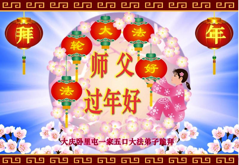 黑龍江省大慶臥裏屯一家五口大法弟子跪拜師父過年好!