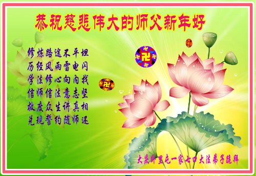 在新的一年裏,在做好三件事的基礎上實修自己,完成史前大願,不辜負師父與眾生對我們的期盼。讓師尊少一些操勞、多一些安慰。在此一家七口大法弟子跪拜師父,感謝師尊的慈悲救度。