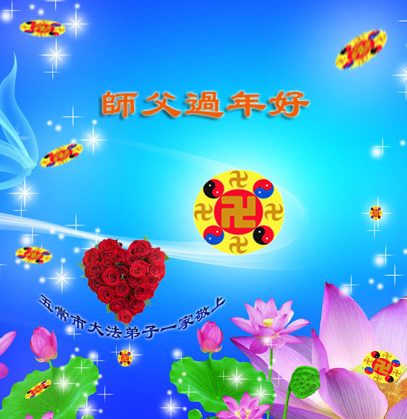 黑龍江省佳木斯永安小區一大法弟子家屬代表全家三口人祝李洪志老師新年快樂!身體健康、萬事如意,早日回到中國大陸!