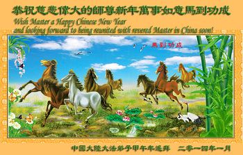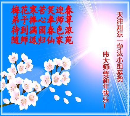 新春到來之際,我們學法小組全體大法弟子恭祝師父過年好!在新的一年裏,弟子們一定會以法為師,遇事向內找,修好自己,相互配合形成強大的整體,排除干擾,圓容師父所要的,救度更多的眾生。