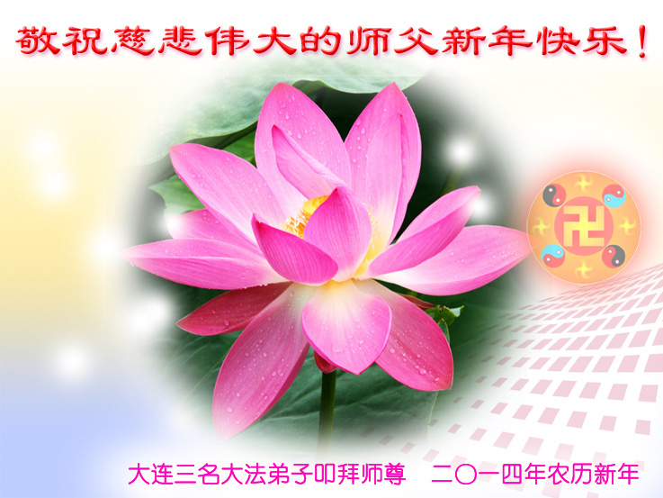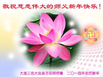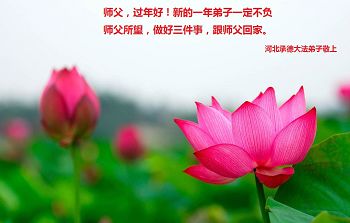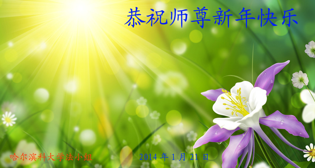 恭祝慈悲偉大的恩師新年好!新年快樂!沐浴師尊的洪恩,我們送走了難忘的2013年,又迎來了一個充滿希望的新一年。在過去的一年裏,我們緊跟師尊努力做好三件事,但還存在很多不足的地方。在新的一年裏,我們要努力修去不足,讓師尊少操點心,多救人,我們要做到比學比修,不生懈怠之心,做好三件事,跟上正法進程,感謝師尊的慈悲救度!
