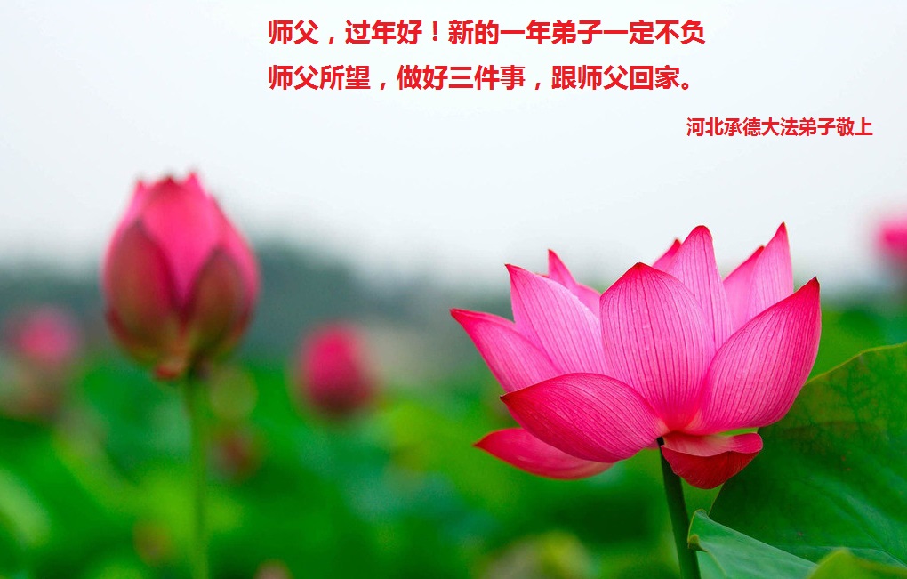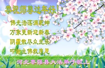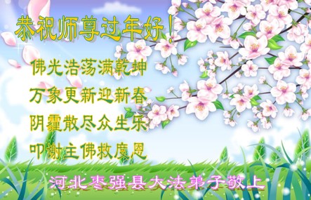 轉眼之間冬去春來,新的一年來臨了。在過去的一年裏,感謝師父對弟子的慈悲救度!感謝師父對眾生的洪大慈悲!感謝師父延長時間給弟子彌補的機會!我和妻子同修在這裏恭祝偉大的師父新年快樂,身體健康。在新的一年裏,我們夫妻一定要做的更好一些,讓師父為弟子少一些承受,多一些欣慰。