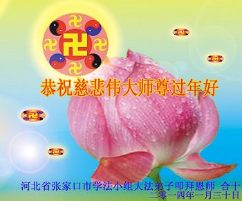 尊敬的師父新年好!在這新年到來之際,我們學法小組的大法弟子第一次懷著無以言表的心情給師尊拜年!在師尊的慈悲與佛恩浩蕩下,我們又讓師尊多操勞了一年。我們知道師尊給了我們能夠圓滿的一切,還給了我們不知道的,我們何以回報,唯有精進、再精進,踏踏實實的做好三件事,報答師父的慈悲救度,兌現自己的史前大願,乘上師尊的法船駛向圓滿的彼岸。再一次期盼師尊早日回大陸和大陸弟子團聚,我們都很想念您。叩拜師尊!