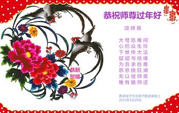 我代表全家及學法小組的全體大法弟子向慈悲偉大的師尊問好,敬祝師尊新年快樂!師尊用自己巨大的付出為眾生延長了時間,在今後的日子裏,我們一定珍惜時間,下功夫學法,紮紮實實向內找,放下自己,一切為了眾生,切實做好三件事,讓師尊有一些欣慰。