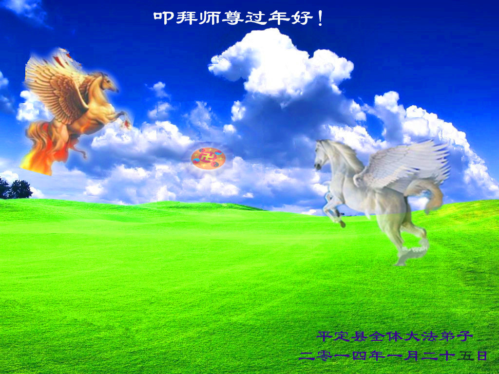 靈丘縣全體大法弟子給慈悲偉大的師尊拜年,祝師尊新年快樂!請師尊放心,我們一定不辜負您的慈悲苦度,全盤否定舊勢力的安排,識破舊勢力的陰謀,消除間隔,走師父安排的路,整體昇華,共同精進,做好三件事,多救人,圓滿隨師還。 靈丘縣全體大法弟子跪拜