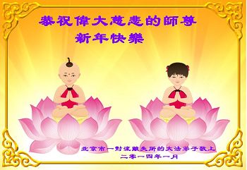在二零一四傳統新年到來之際,山東省濰坊市壽光一大法弟子代表學法小組和家人叩拜師尊,給師尊拜年,感恩師尊慈悲苦度,恭祝師尊新年好。