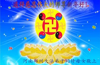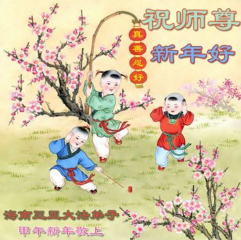 在二零一四年的黃曆新年佳節即將來臨之際,我們幾位飽受師父恩澤,時時沐浴在法光中的大法弟子以無比崇敬和萬分喜悅的心情向慈悲偉大的師父拜年:恭祝偉大慈悲的師父新年快樂!惟願師父在新的一年笑口常開!在宇宙正法的關鍵歷史時刻,我們一定要聽師父的話,做好三件事,多救人!快救人!兌現自己的誓約,珍惜這來之不易的萬古機緣,以報答師父對宇宙眾生的救度之恩!