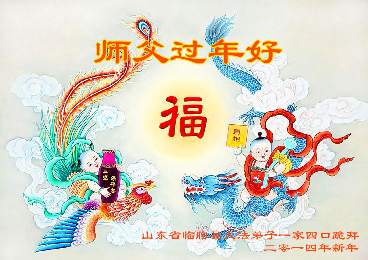 山東濰坊臨朐縣大法弟子一家四口恭祝師父過年好!