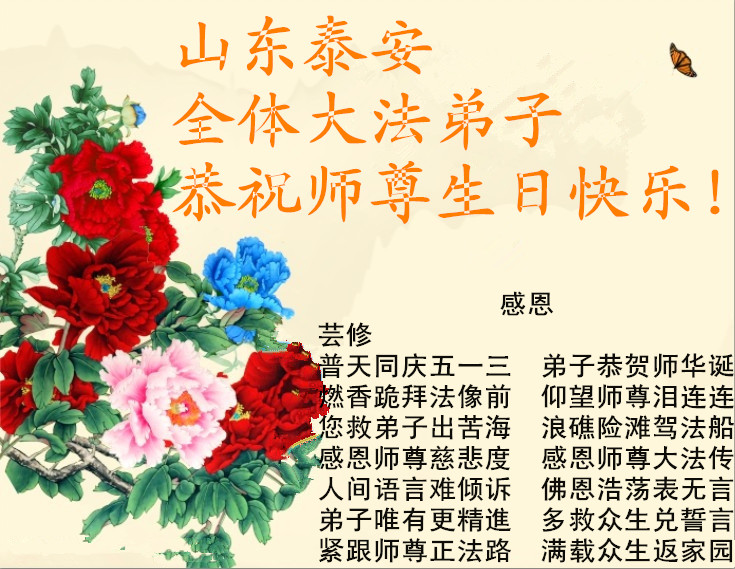 在師父華誕和世界法輪大法日到來之際,山東省沂源縣大法弟子跪拜師父:恭祝慈悲偉大的師父生日快樂!師父您好,弟子會珍惜時間,做好三件事,跟師父回家!