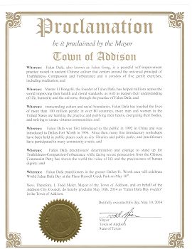 美國德州達拉斯-福特沃斯地區法輪功學員於二零一四年五月十日在布蘭諾Russell Creek公園舉辦活動慶祝世界法輪大法日和法輪大法弘傳二十二週年。德克薩斯州愛迪遜市(Addison)市長陶德•密伊爾(Todd Meier)頒發褒獎,宣布五月十日為法輪大法日。