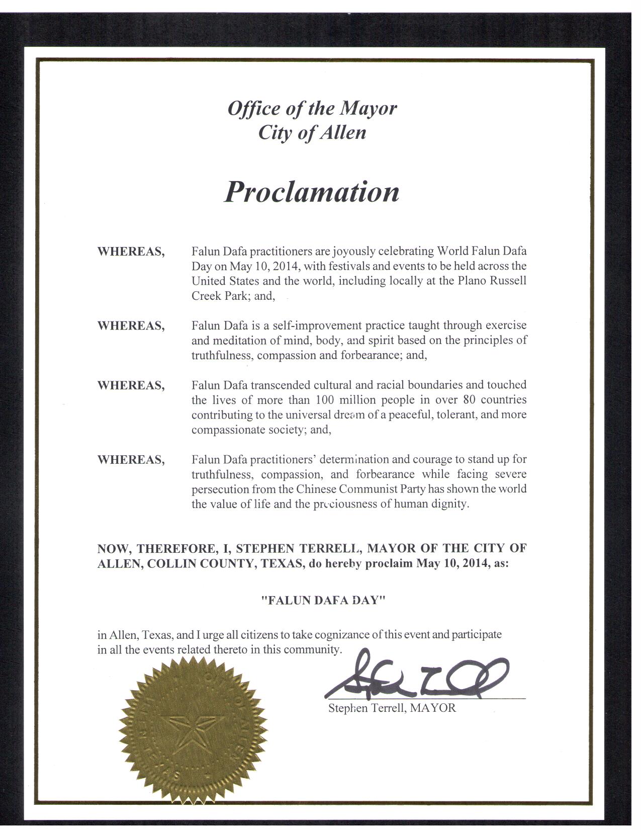 二零一四年五月十三日世界法輪大法日即將到來,美國德克薩斯州艾倫市市長史蒂夫•泰瑞爾宣布五月十日為法輪大法日,他還稱讚法輪大法學員面對中共的迫害,仍堅持「真、善、忍」信仰的精神和勇氣。