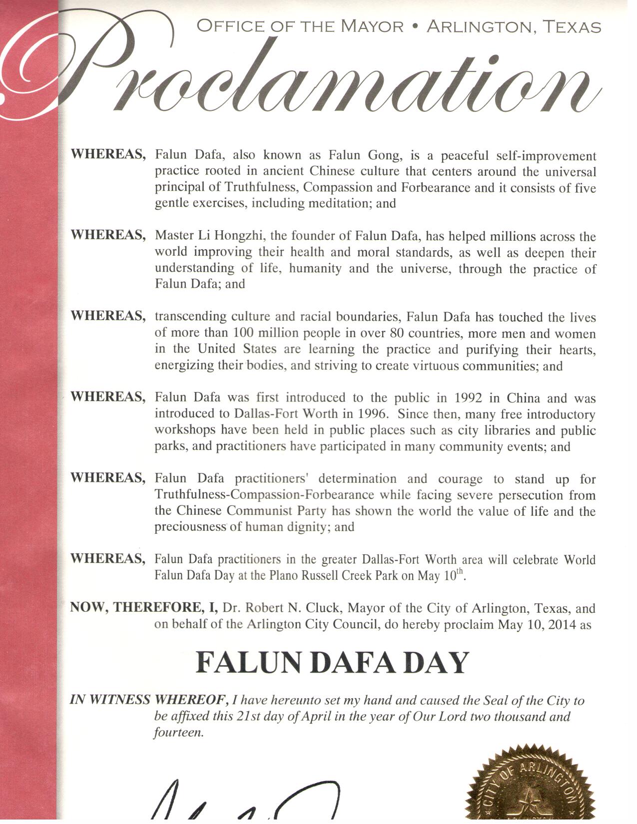 美國德克薩斯州阿靈頓市(Arlington)市長羅伯特•克拉克(Robert Cluck)宣布五月十日為法輪大法日,讚譽法輪功創始人李洪志先生所傳的法輪大法改善了人們的身體健康並提升了他們的道德水準。