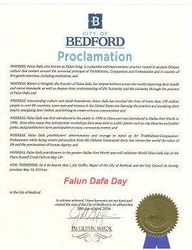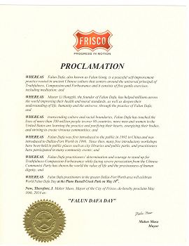 鑑於,法輪大法,又稱法輪功,於一九九二年在中國傳出。一九九六年法輪大法洪傳到達拉斯-福特沃斯地區。從那以後,在達福地區舉辦了許多期免費法輪大法教功班;並且