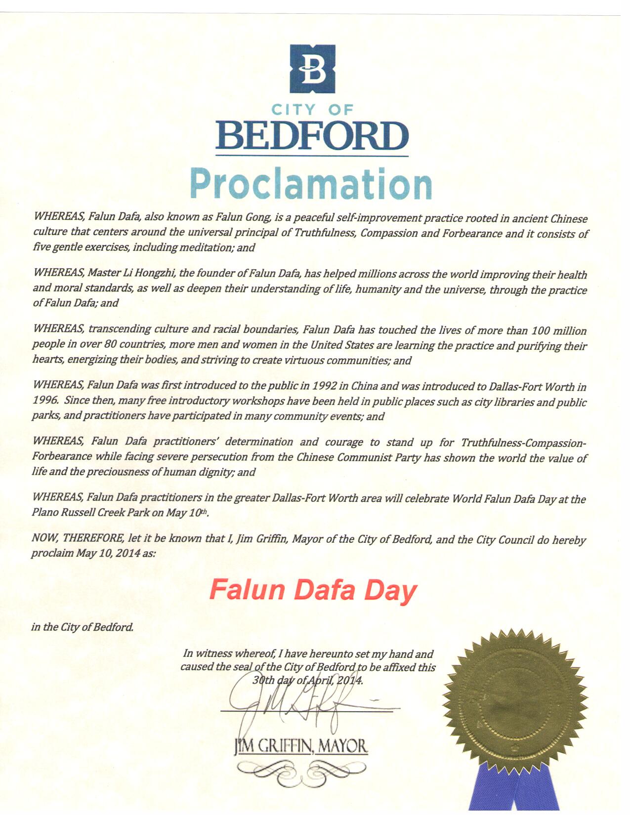 美國德州達拉斯-福特沃斯地區法輪功學員於二零一四年五月十日在布蘭諾Russell Creek公園慶祝即將到來的世界法輪大法日,法輪大法弘傳世界二十二週年。美國德克薩斯州伯德福特市(Bedford)市長吉姆•格裏芬(Jim Griffin)宣布宣布五月十日為法輪大法日,褒獎法輪功對社區的貢獻。