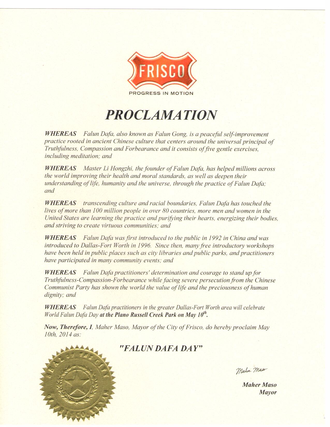 美國德州達拉斯-福特沃斯地區法輪功學員於二零一四年五月十日在布蘭諾Russell Creek公園舉辦活動慶祝世界法輪大法日和法輪大法弘傳二十二週年。德克薩斯州弗瑞斯科市(Frisco)市長馬赫•馬索(Maher Maso)頒發褒獎,宣布五月十日為法輪大法日。