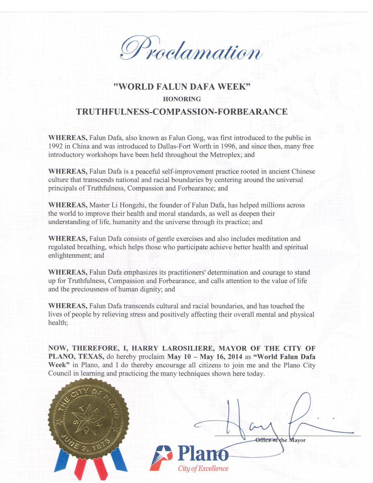因此,我,哈裏•拉羅斯裏爾(Harry Larosiliere),德克薩斯州布蘭諾市(City of Plano)市長,在此宣布二零一四年五月十日至十六日為布蘭諾市