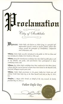 美國德州達拉斯-福特沃斯地區法輪功學員於二零一四年五月十日在布蘭諾Russell Creek公園舉辦活動慶祝世界法輪大法日和法輪大法弘傳二十二週年。德克薩斯州南湖市(Southlake)市長約翰•特雷爾(John Terrell)頒發褒獎,宣布五月十日為法輪大法日。