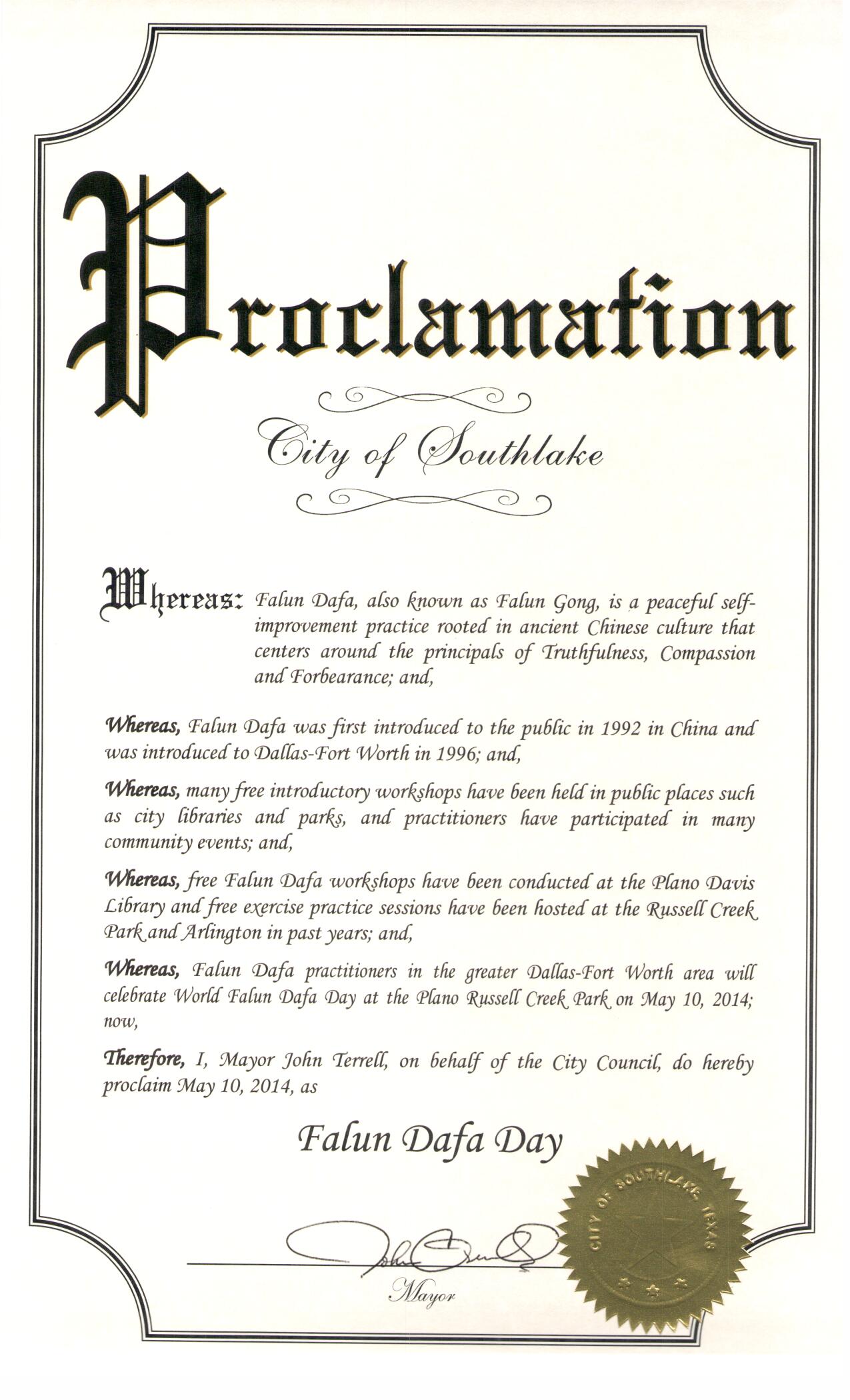 鑑此,我,約翰•特雷爾(John Terrell),南湖市(Southlake)市長,代表市議會宣布二零一四年五月十日為
