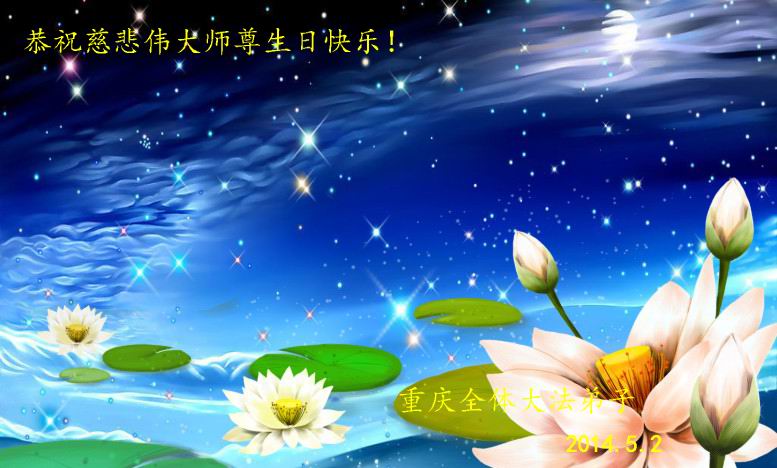 重慶全體大法弟子想念師尊!盼師尊早日回歸大陸。我們會聽師尊的話,用師尊給我們的法寶(向內找)精進實修,信師信法的心堅如磐石,用神的正念助師正法,兌現誓約,用純淨的身心迎接師尊回歸中原。惟願師尊笑!叩拜恩師!