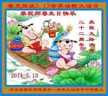 河北省保定高碑店市一老年大法弟子恭賀慈悲偉大的師尊生日快樂!普天同慶5.13世界法輪大法日!慶祝大法洪傳二十二週年!
