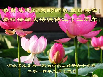 河北省保定一大法弟子攜全家和學法小組弟子祝師尊生日快樂!祝法輪大法洪傳世界二十二週年!