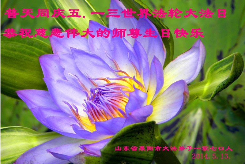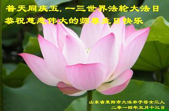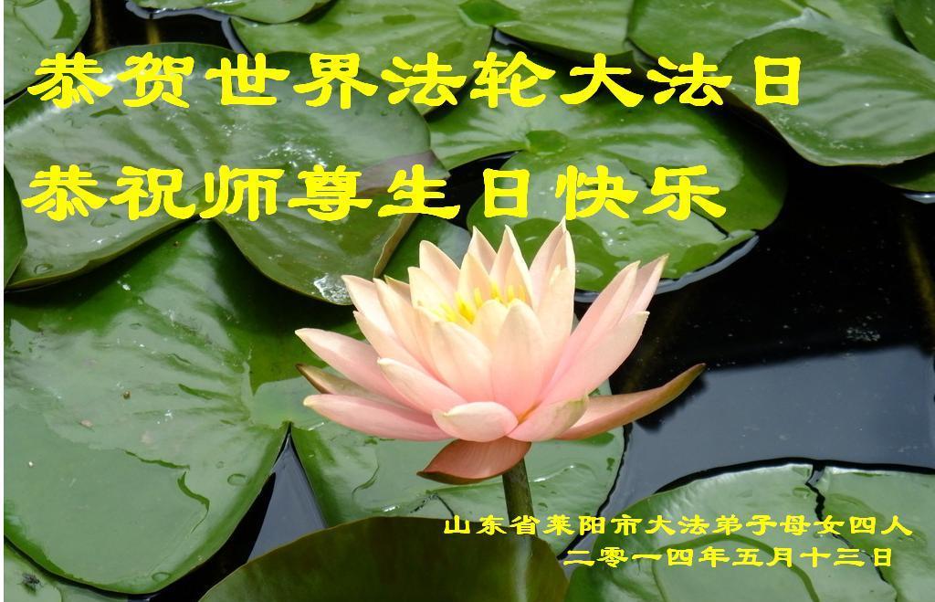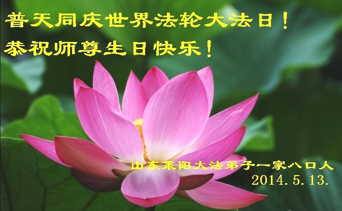 山東省煙台市萊陽市一家五名大法弟子恭祝慈悲偉大的師尊生日快樂!敬賀「5.13」世界法輪大法日!