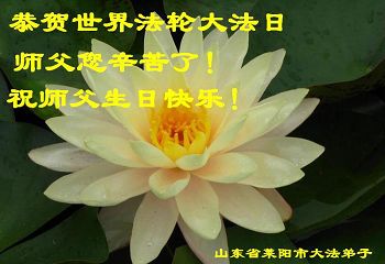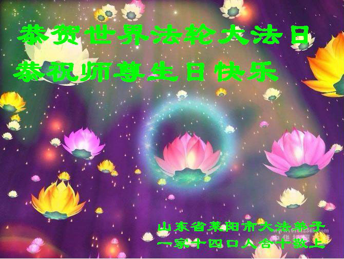 山東省煙台市萊陽市柏林莊鎮全體大法弟子恭祝慈悲偉大的師尊生日快樂!恭賀世界法輪大法日!並恭慶法輪大法洪傳二十二週年!