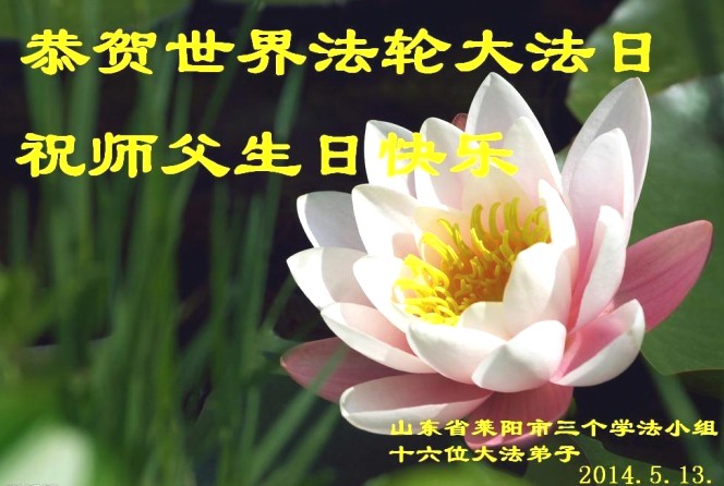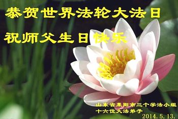 山東省煙台市萊陽市兩個學法小組的大法弟子恭祝慈悲偉大的師尊生日快樂!恭賀世界法輪大法日!恭慶法輪大法洪傳二十二週年!
