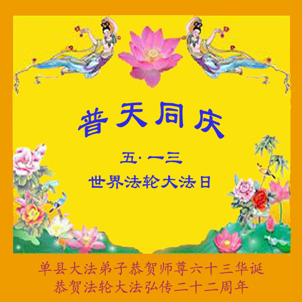 山東菏澤單縣大法弟子恭賀第十五屆法輪大法日暨慈悲偉大的師尊華誕!