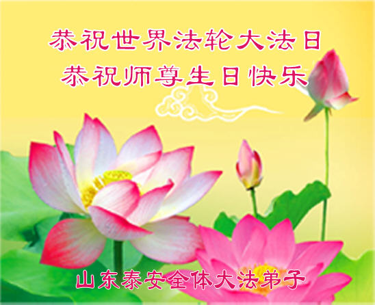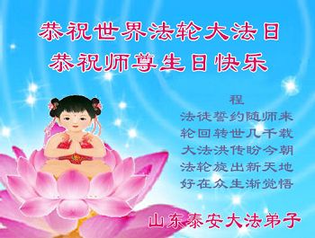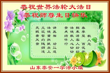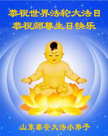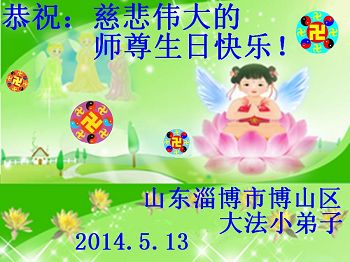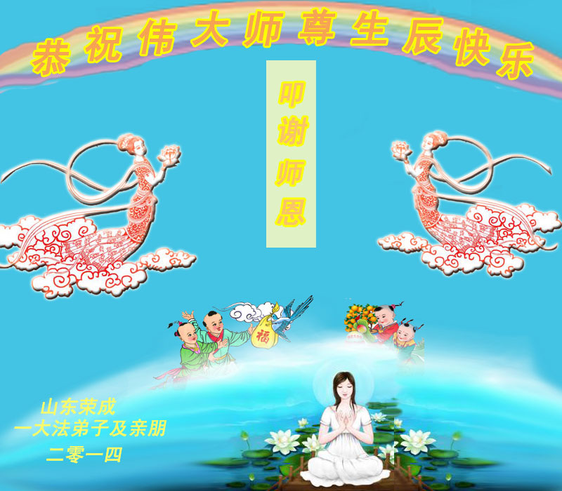 慈悲的師尊好:在您的呵護下,俺磕磕絆絆的走到了今天,懂得了修煉過程是不斷的去人的執著心的過程,轉變觀念,把自己當神一樣甚麼都不在意,遇事向內找,徹底從骨子裏去掉人的觀念,脫掉人的殼,一切都會改變。師父啊,您為俺的慈悲苦度、護佑、承受吃了無數的苦,真是「青絲斑白人體傷」,我只有做好三件事,多救人,跟您回家。在這雙好的大好日子裏,我高呼:衷心祝願師尊生日快樂!