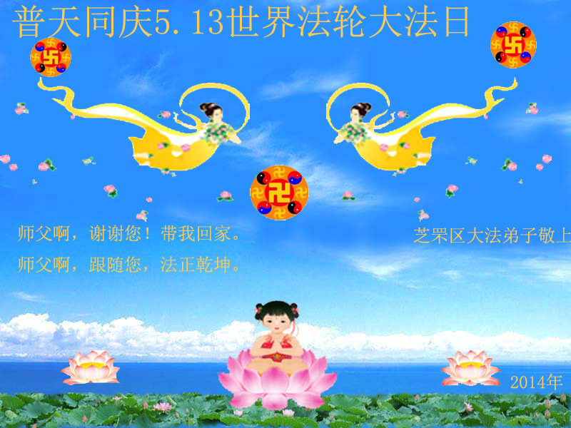 「五一三」這個震撼寰宇的日子,將永遠記載在人類歷史的史篇中。宇宙的主佛層層下走,此日來到人間,以人身在人間傳宇宙根本大法──法輪佛法,以浩蕩的佛恩挽救眾生、正大穹,使之走向永遠不壞不滅的新階段,我們有幸成為主佛的弟子,又是正法時期的大法弟子,感到無比的榮幸。我們一定盡力做好弟子該做的三件事,助師正法,滅盡邪惡,修好自己,圓滿跟師父回家。
