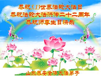 「五•一三」又到了,在這普天同慶的日子裏,弟子們謹以最謙恭誠摯的心情恭祝世界法輪大法日暨恭祝師尊華誕。