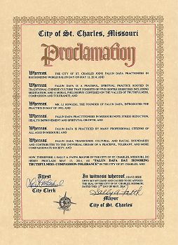 鑑於,聖查爾斯市和法輪大法修煉者於二零一四年五月十三日共同慶祝世界法輪大法日;並且