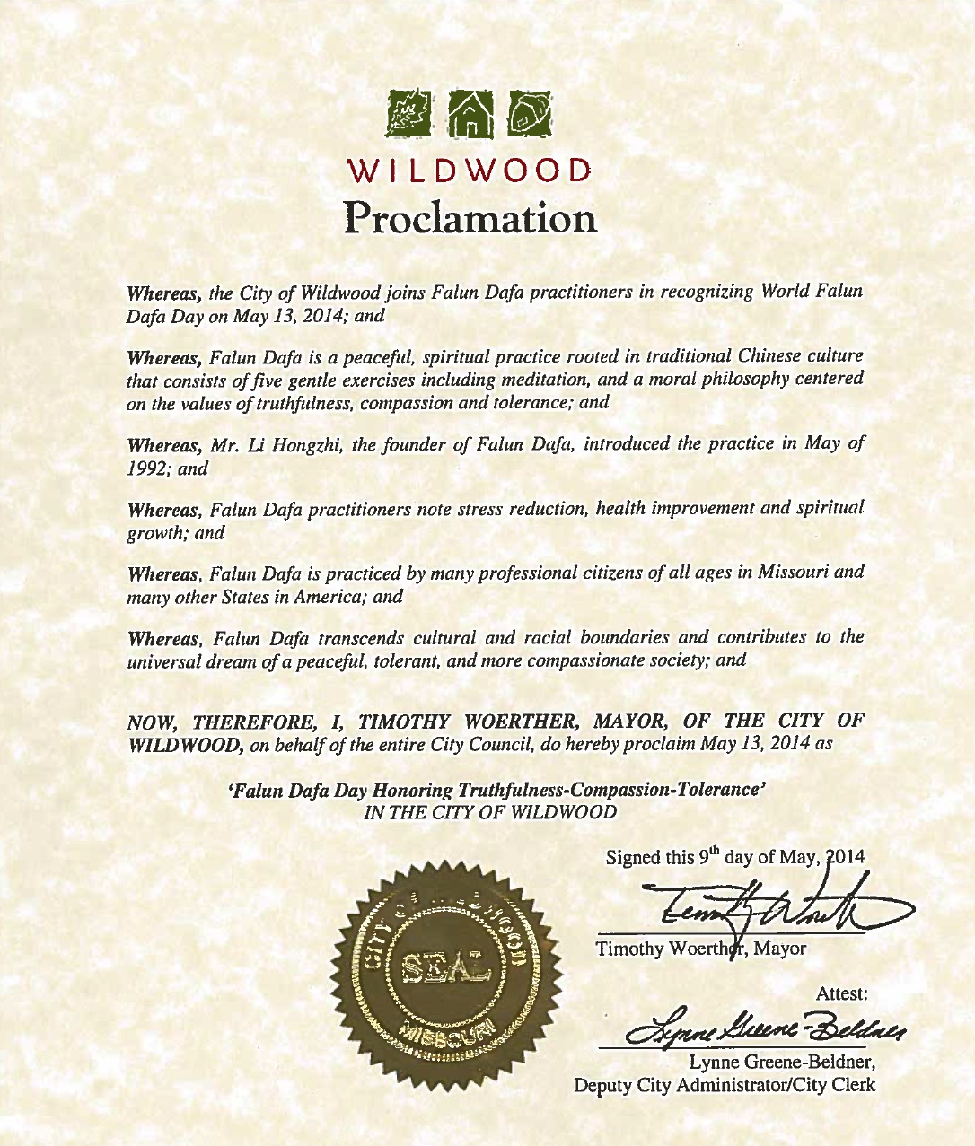 近日,美國密蘇裏州維爾德伍德市(Wildwood) 市長Timothy Woerther頒發褒獎令,褒獎法輪大法,宣告二零一四年五月十三日為密蘇裏州維爾德伍德市「法輪大法日」。