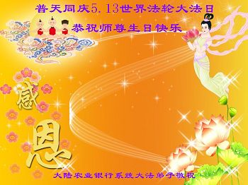 中國大陸金融行業大法弟子在師父的生日即將到來之際,祝師父生日快樂!在普天同慶法輪大法的美好日子來臨之際,祝大法慶典圓滿成功,願大法的光輝永遠照耀寰宇。